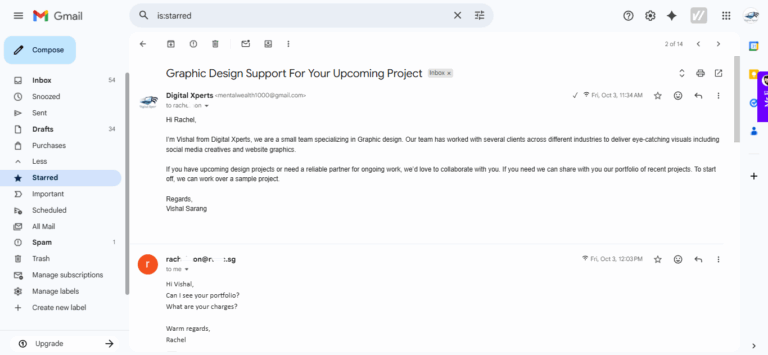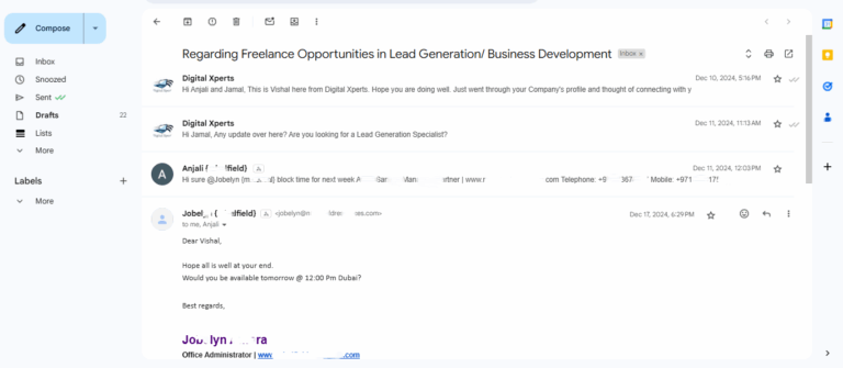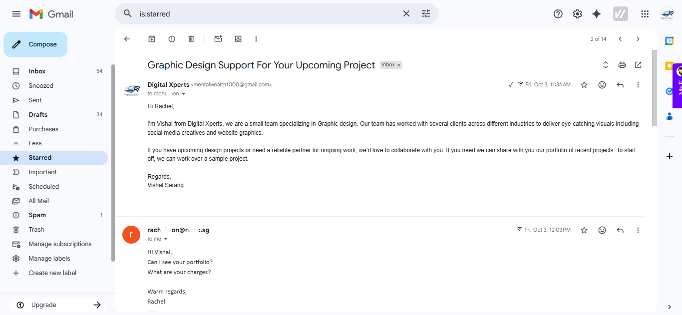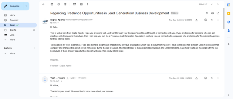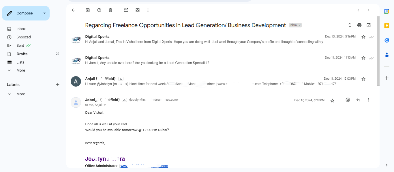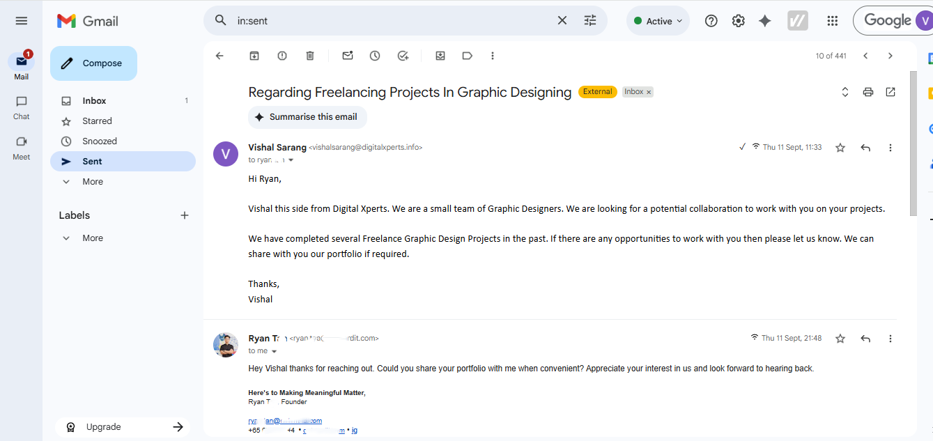 I have also emailed people to understand the market in several different industries like Graphic Design, Recruitment for Experimentation purposes. Email was drafted and curated by me, not ChatGpt. Sent it on different timelines. It has given me a decent number of positive responses though it was just for testing. Below are some Screenshots of my emails you can go through. Personal Information is blurred for privacy purposes. You can tap to zoom in.